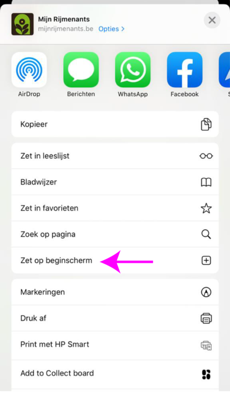 Surf op je smartphone via een browserapp (bv. Safari, met de Google-app werkt het niet) naar www.mijnrijmenants.be. Tik onderaan in de browserbalk op het middenste icoon om het menu te openen. Je kan ook de knop 'installeer als web app' gebruiken die via een pop-up balk verschijnt.